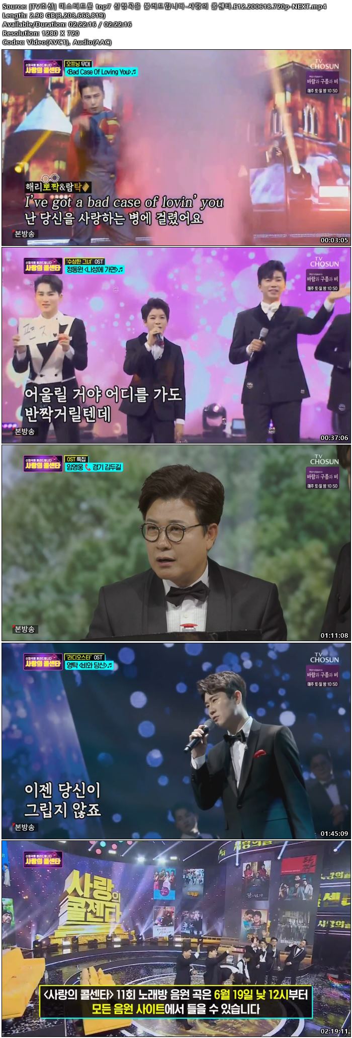 radio 방송/동영상 TV조선 미스터트롯 top7 [TV조선] 미스터트롯 top7 신청곡을 불러드립니다-사랑의 콜센타.E12.20061 person 파일드드득 calendar_today 2026.01.01 visibility 3,651 다운로드 1개 파일 folder_zip [TV조선] 미스터트롯 top7 신청곡을 불러드립니다-사랑의 콜센타.E12.200618.720p-NEXT.mp4 3.0G download