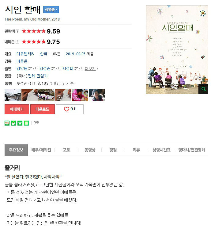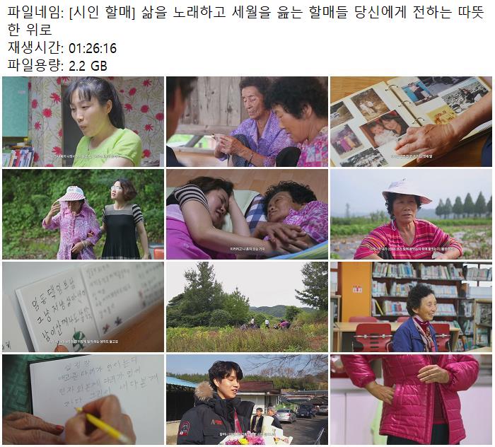 movie 영화 시인 할매 삶을 [시인 할매] 삶을 노래하고 세월을 읊는 할매들 당신에게 전하는 따뜻한 위로 person smmbc3 calendar_today 2026.01.01 visibility 3,660 다운로드 1개 파일 folder_zip [시인 할매] 삶을 노래하고 세월을 읊는 할매들 당신에게 전하는 따뜻한 위로.mp4 2.2G download
