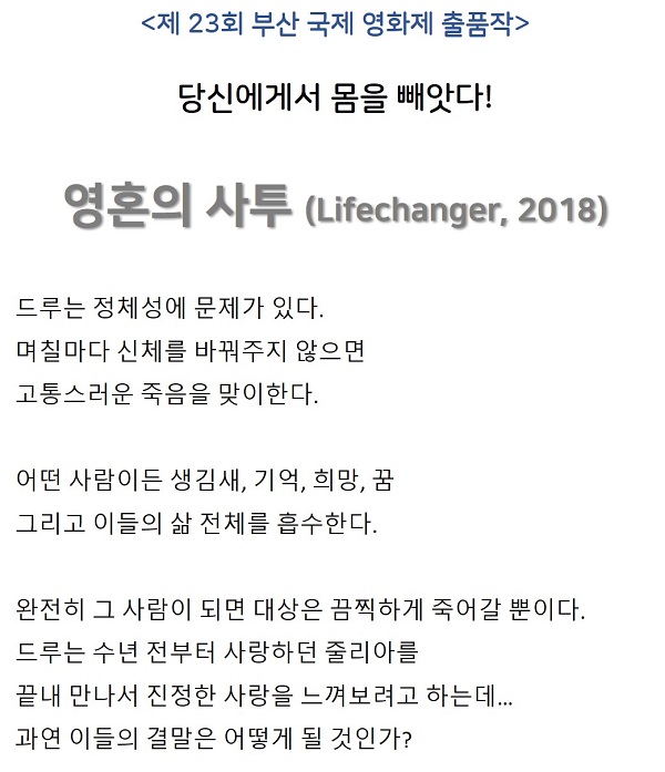 movie 영화 제23회 부산영화제 출품 제23회 부산영화제 출품 [ 영혼의 사투 ] 공포 스릴러 person nowcontents calendar_today 2026.01.01 visibility 3,325 다운로드 1개 파일 folder_zip 영혼의사투_FHD.mp4 2.9G download