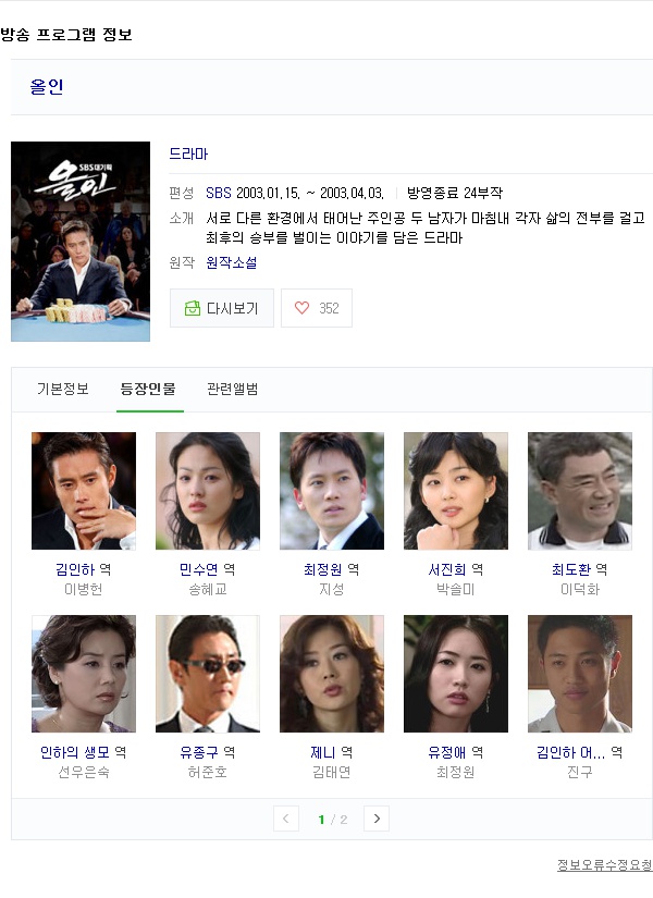 tv 드라마 올인 01화 24화 올인 [ 01화 - 24화 완결 ] 이병헌 송혜교 지성 person chs03700 calendar_today 2026.01.01 visibility 3,082 다운로드 6개 파일 folder_zip 올인 01부.avi 16.4G download folder_zip 올인 02부.avi download folder_zip 올인 03부.avi download folder_zip 올인 04부.avi download folder_zip 올인 05부.avi download folder_zip 올인 06부.avi download