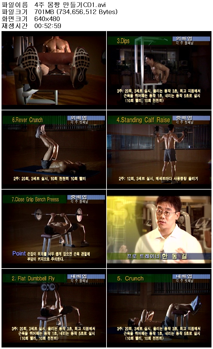 radio 방송/동영상 강좌 4주 몸짱 [강좌]4주 몸짱 만들기 person 하나된조국 calendar_today 2026.01.01 visibility 4,407 다운로드 2개 파일 folder_zip 4주 몸짱 만들기CD1.avi 1.4G download folder_zip 4주 몸짱 만들기CD2.avi download